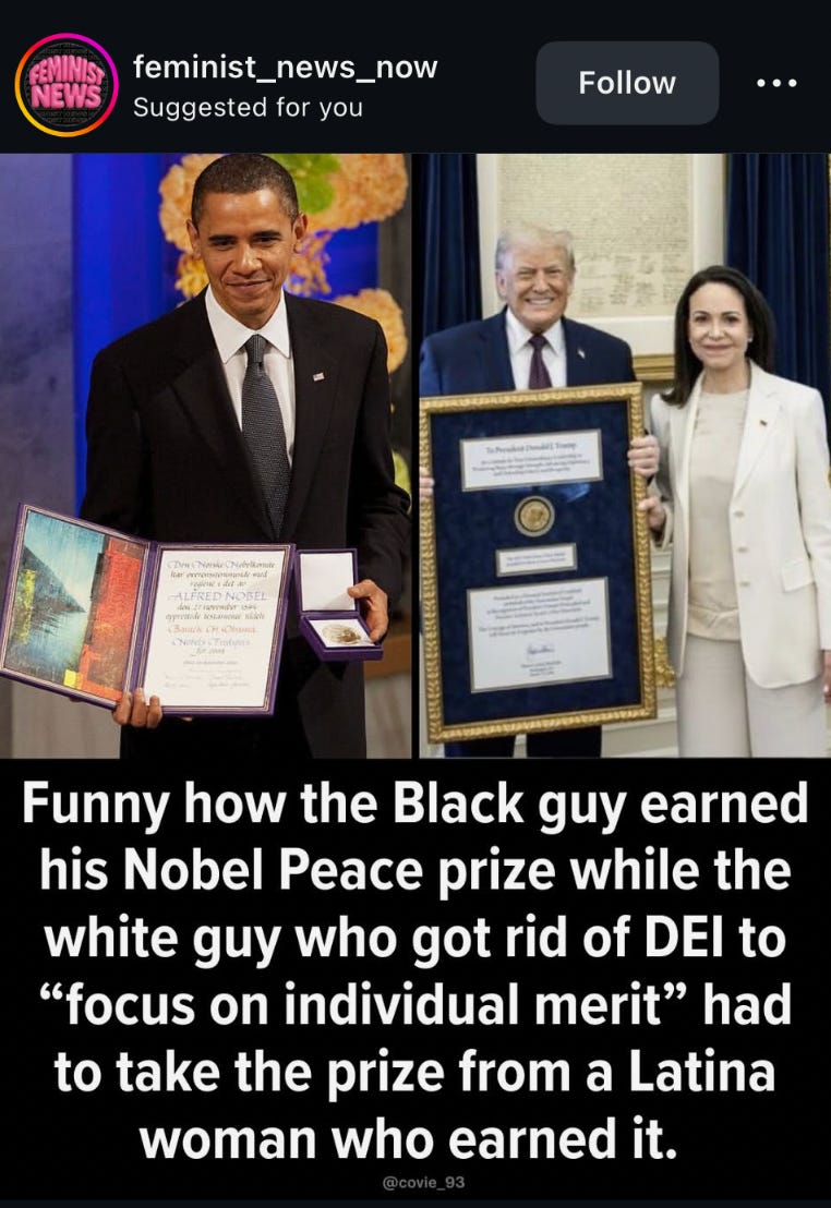 I’m aware Donald Trump does a lot of bonkers things. Every. Single. Day. But let’s actually consider this one. He had never met María Corina Machado before yesterday. She clearly wants to ingratiate herself with him, and knows he has a creepy, almost sexual fixation with the Nobel. So she offered it to him. Like a stuffed toy to an infant.