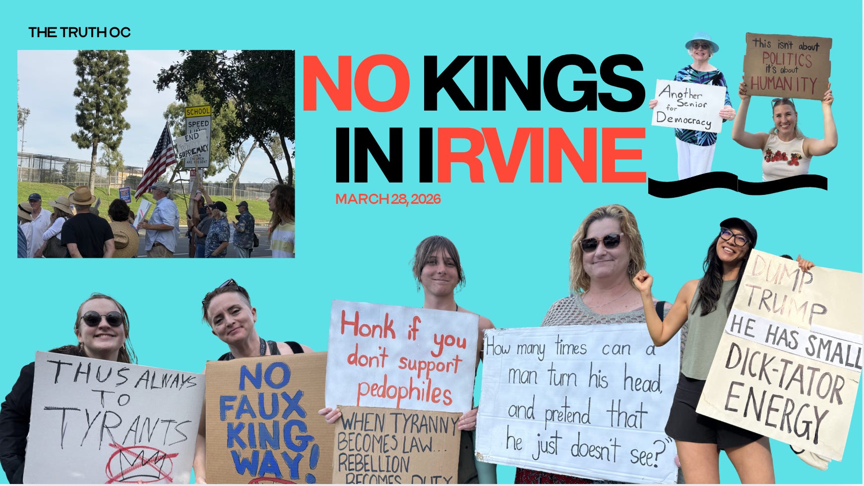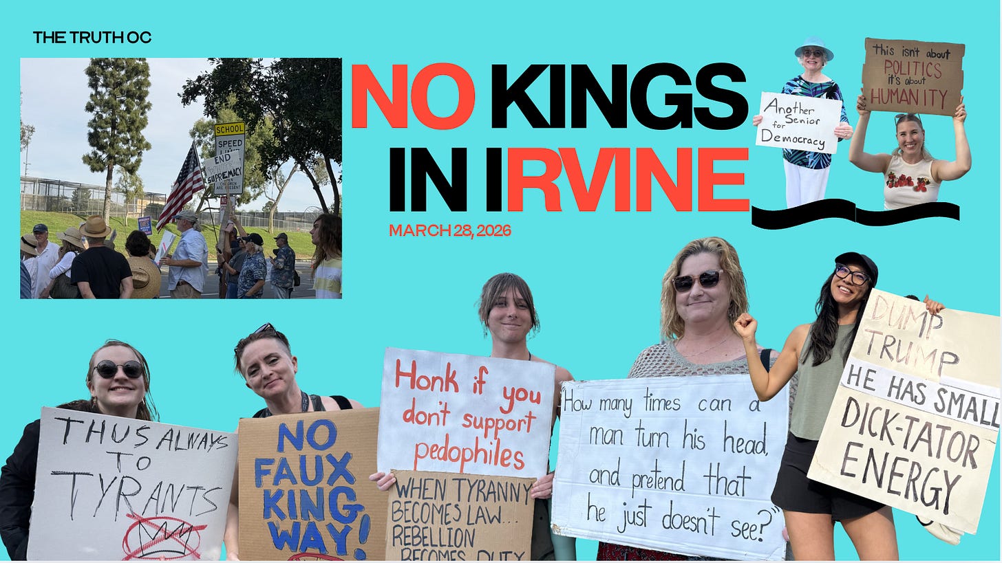 This is a long way of explaining that it is 6:19 pm, and I’ve just returned from the corner of Harvard and Culver in Irvine, where Indivisible hosted a fantastic No Kings rally.