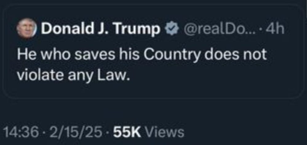 It’s a wild notion, if you think about it, that a good number of Americans (land of the free, home of the brave) seem comfortable with a president (especially if he’s a vengeful narcissist who enjoys raping women) announcing the law does not apply to him.
