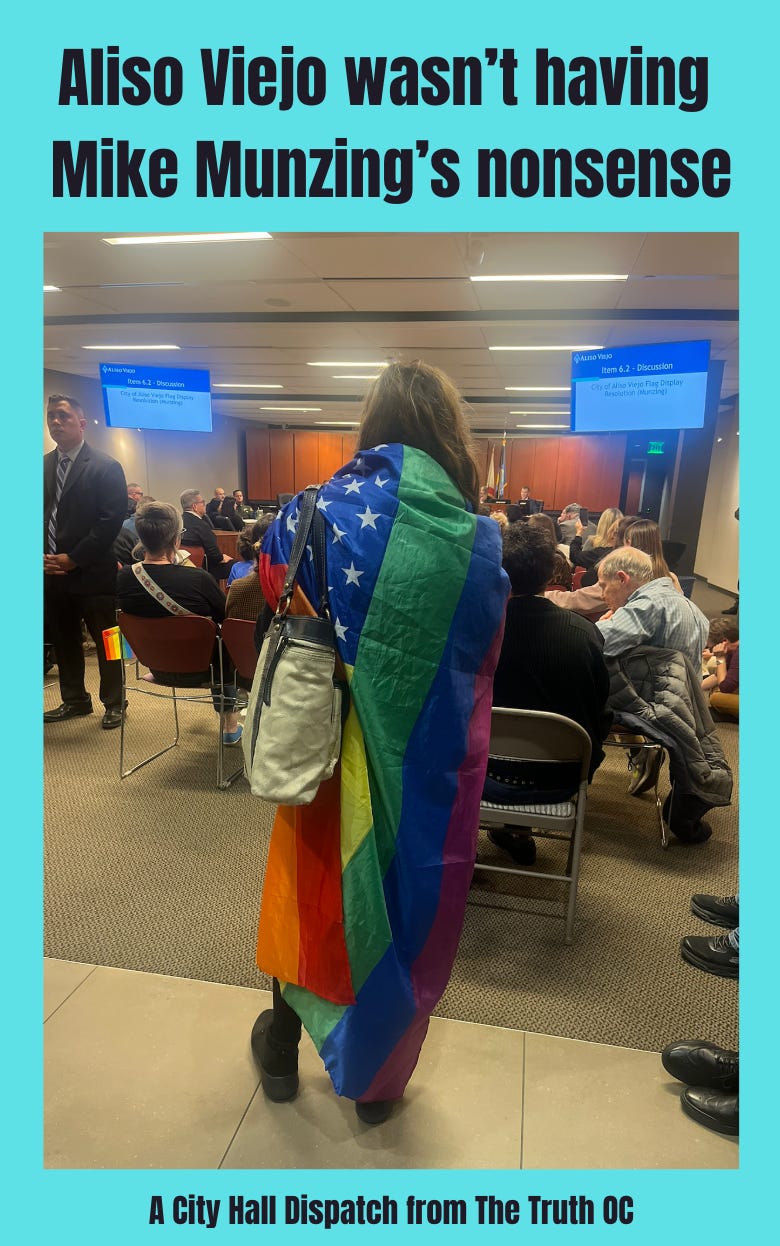 We were (with some exception) there not to shake hands with Richard Hurt or grab a bite at the bewildering nearby oatmeal restaurant, but to speak out against what was officially labeled, “Discussion 6.2: City of Aliso Viejo Flag Display Resolution.”