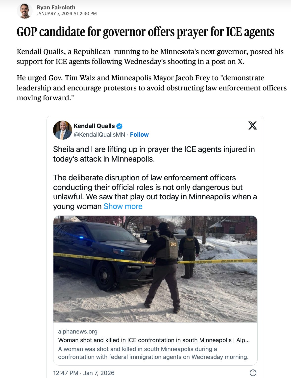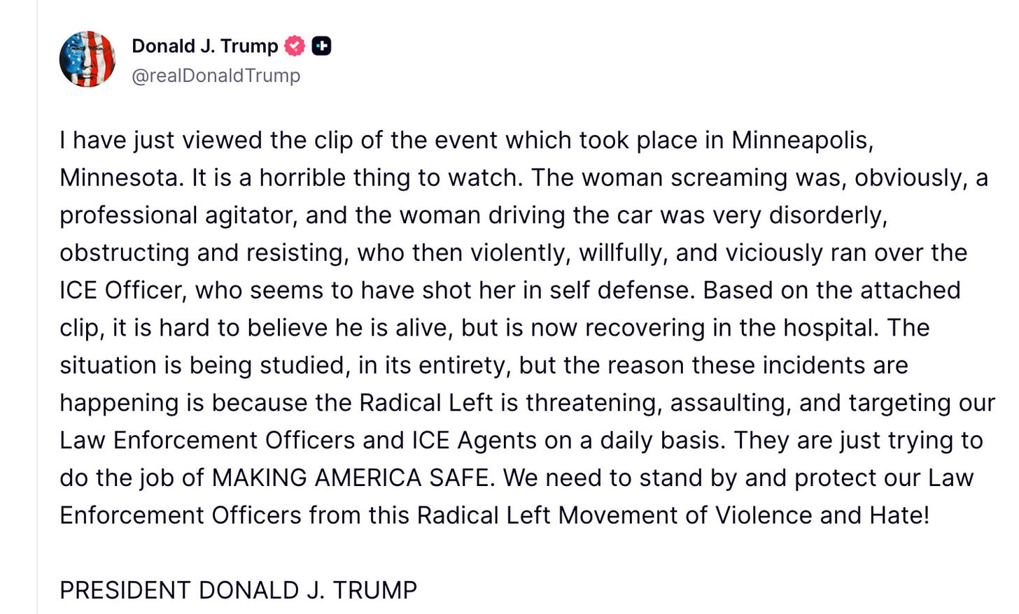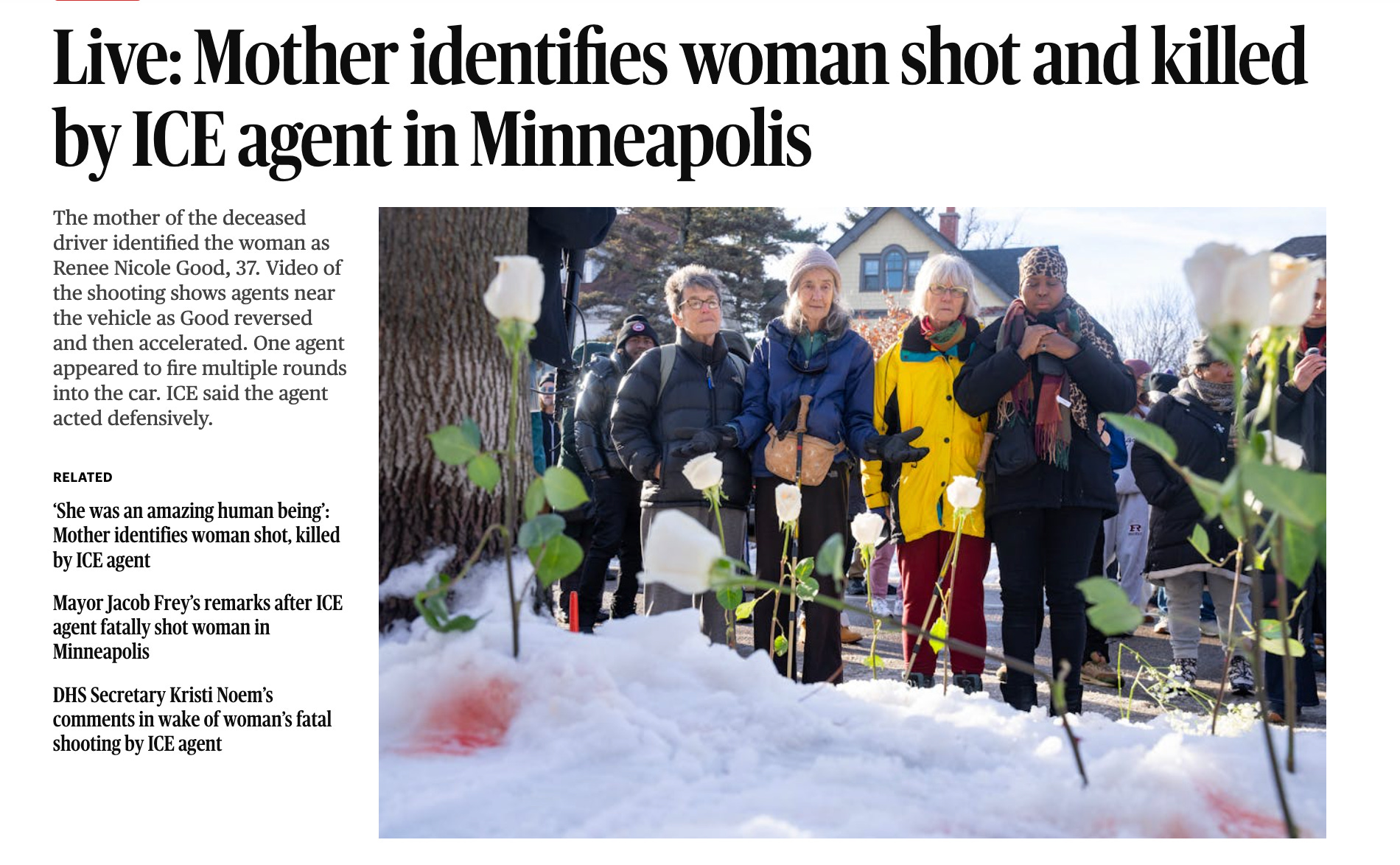 In case you have yet to see this, earlier today a Minneapolis-based ICE agent fired into a moving vehicle and killed the driver. A 37-year-old American woman named Renee Nicole Good.