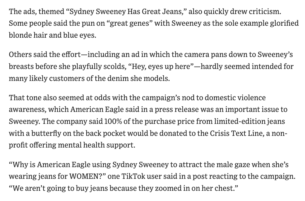 I noted the Sydney Sweeney dust-up and moved on. But may I point out — not in shaming, but in the same winking way I’d do it with the fabulous kind men I live around — that it’s maybe a bit harder for a white guy of a certain age to grasp how many women are weary to the bone of being objectified, how every one of us understands that it’s stuff like this that adds to the myriad reasons why not one single woman reading this can walk alone in a parking garage, a dark street or even a well-lit city street without the constant underbeat of scanning her surroundings for predatory men? And how many of us are speaking up for the young women around us who have not yet found their voices? And that’s not even addressing the racism, which is equally destructive. Since I am white, I leave that to my friends of color to share their experience. Yes, we have bigger fish to fry than the ad. But yes, calling it out is the right thing to do.