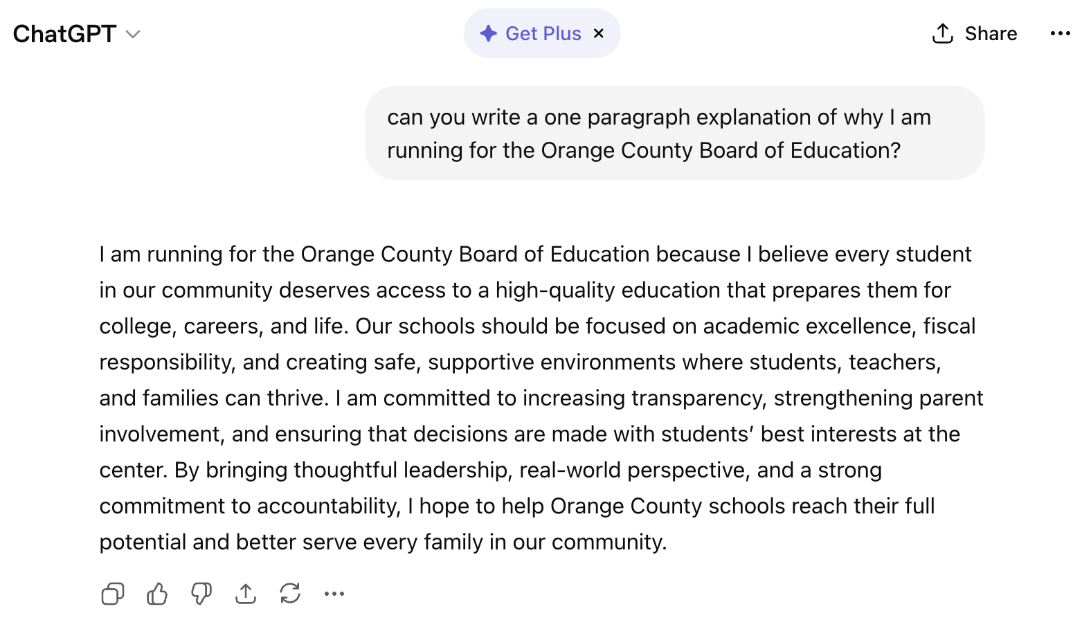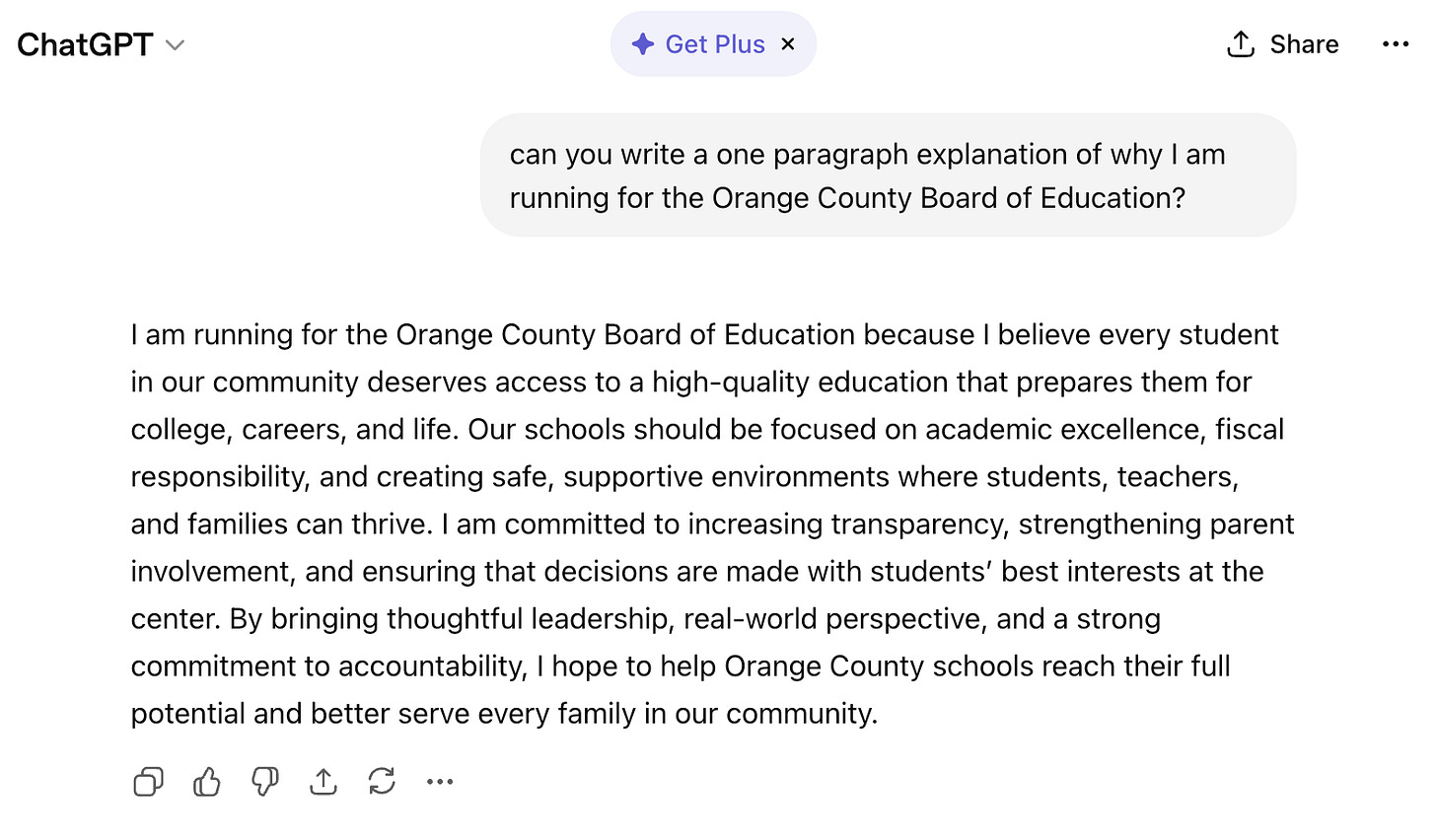 Just for kicks, I asked ChatGPT to write a one-paragraph summation of why I (Jeff) am running for Orange County Board of Education (which I’m not), and it produced this …