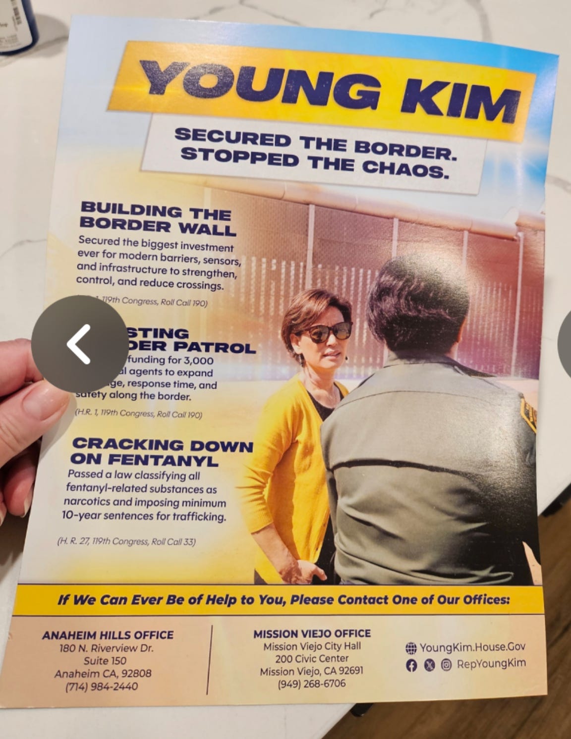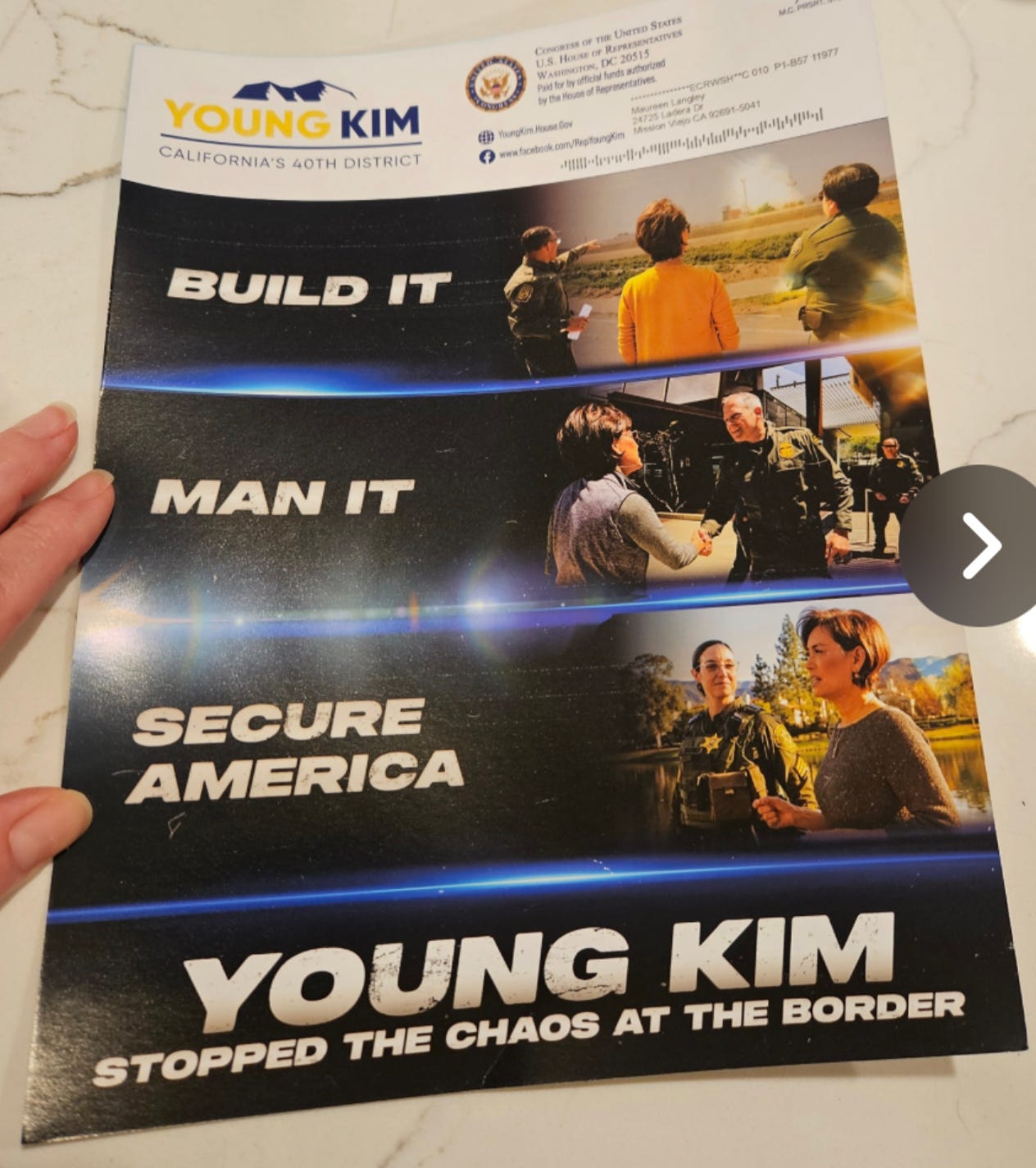 Young Kim, the CA-40 incumbent congresswoman now desperately trying to fight off all challengers, sent out a mailing.