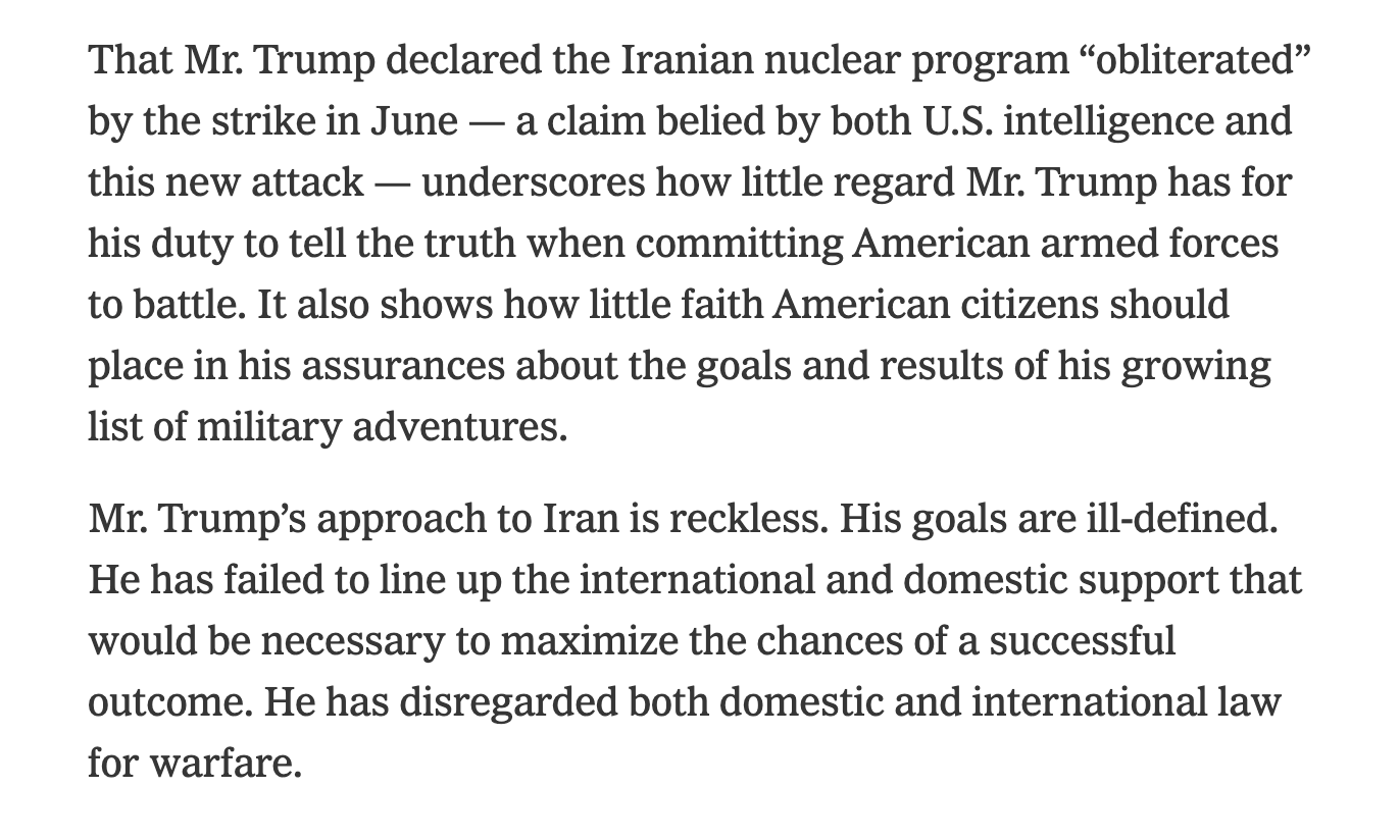 Last year, we were told by Donald Trump that Iran’s nuclear capabilities were kaput. Now, we are being told Iran has the nuclear capabilities to strike the United States. Both cannot be true. As the New York Times wrote just now in, WHY HAVE YOU STARTED THIS WAR, MR. PRESIDENT? …