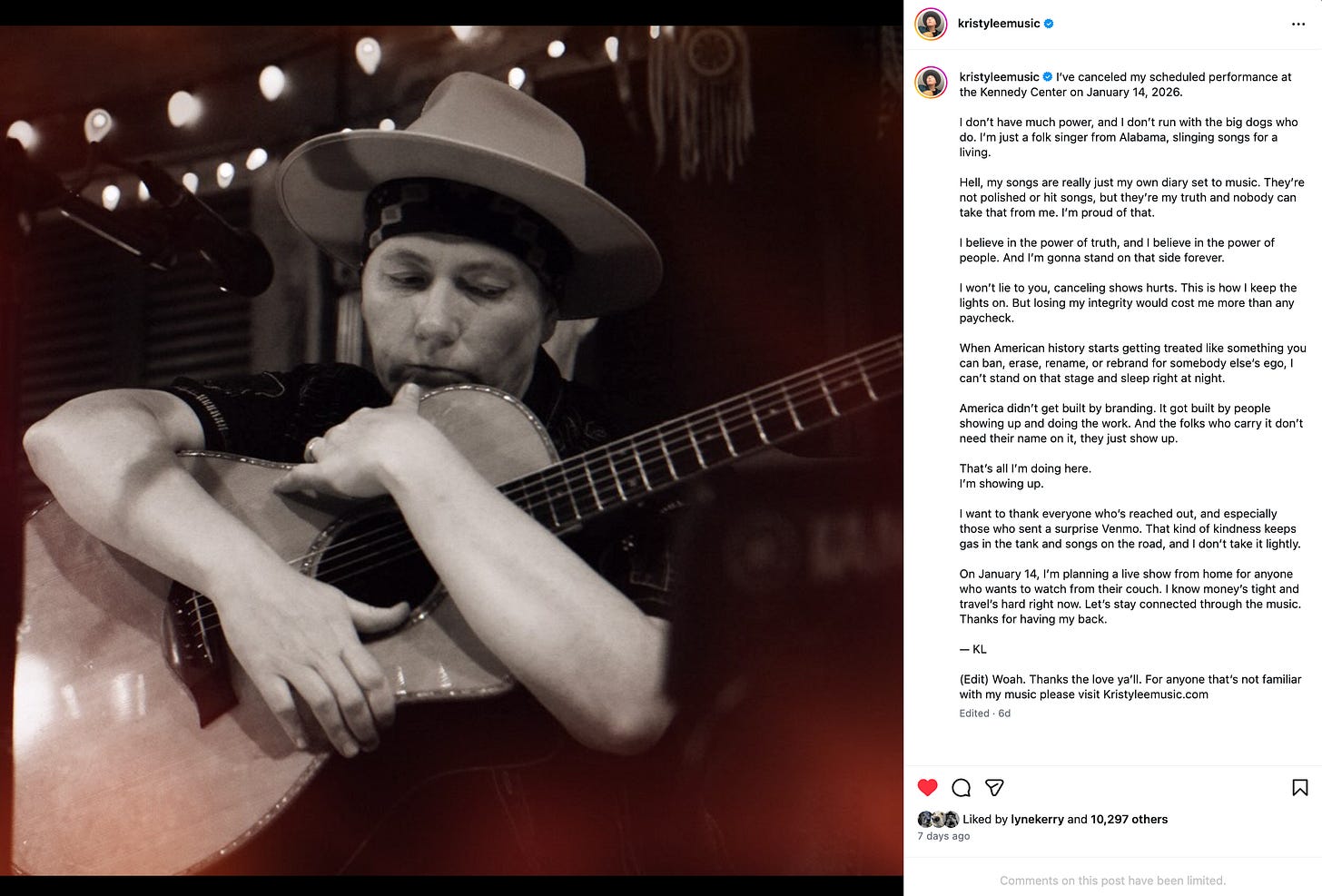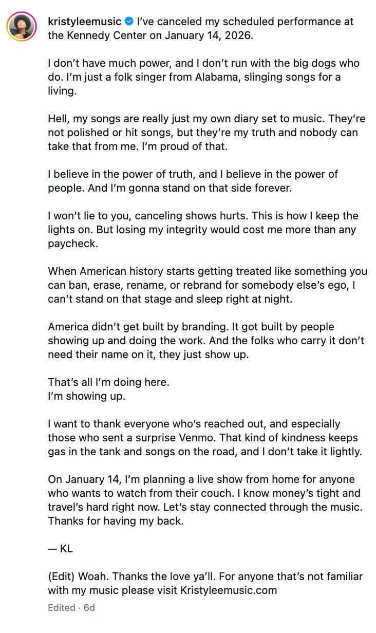 Then, however, I began reading a New York Times article headlined, NEW YEAR’S EVE CONCERTS AT KENNEDY CENTER ARE CANCELLED. And deep in the text, following one big name after another big name, came mention of Lee, a folk singer from Alabama who pulled out of a free concert at the center.