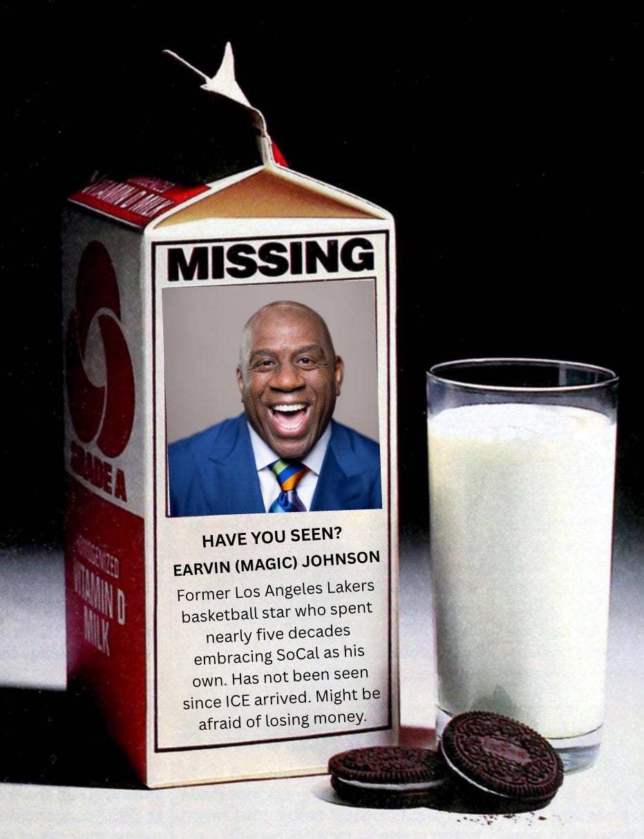 And I’m just sorta wondering, as ICE agents terrorize the city and Donald Trump and Stephen Miller and Tom Homan make us all feel like foreigners in our own country … well … eh, where in God’s name is Magic Johnson? Or, really, where in God’s name is Magic Johnson’s voice?