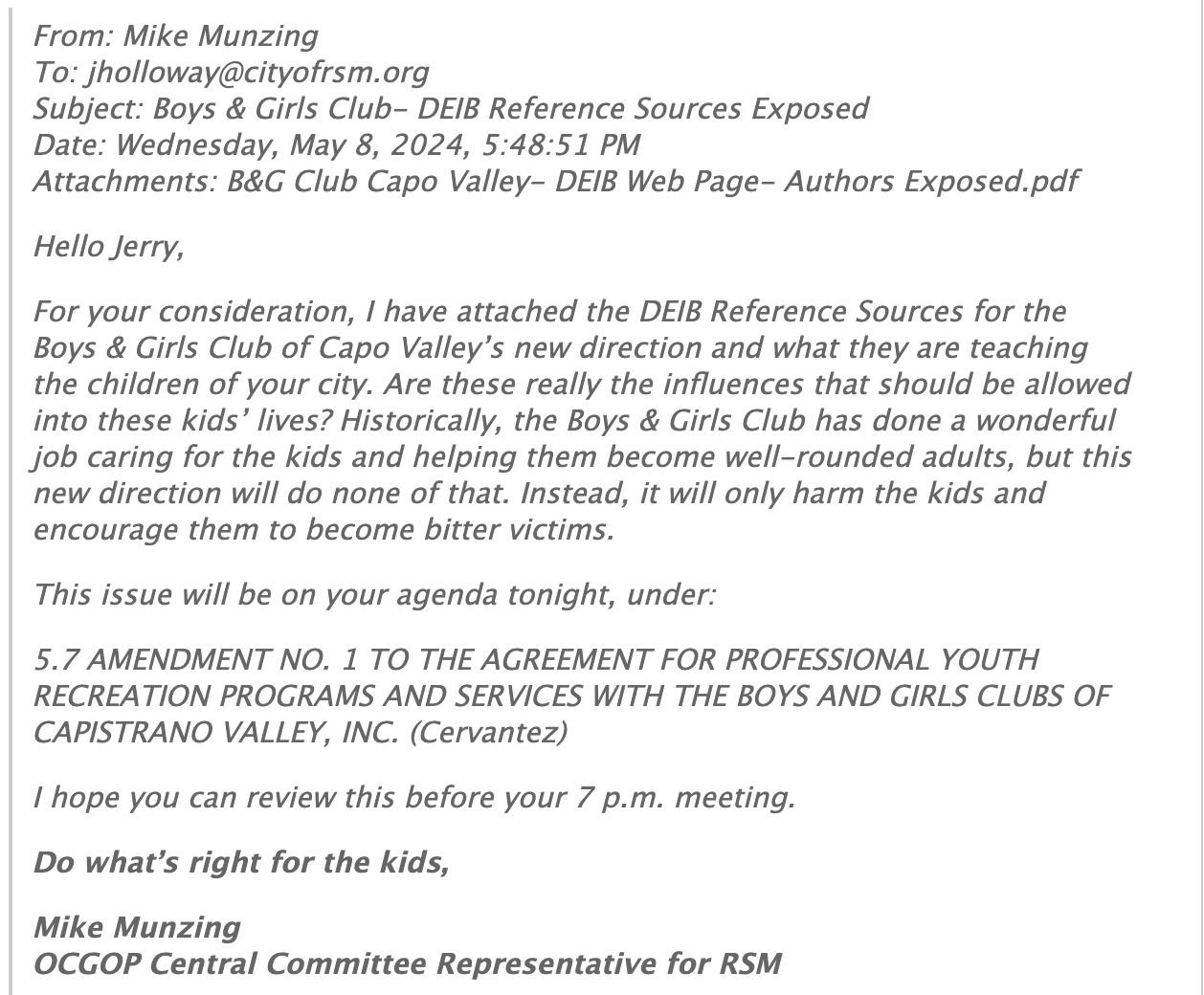 And to read up on Mike Munzing is to come to terms with the human embodiment of an infested pustule. According to this excellent 2024 post from Orange Juice Blog, last August Munzing threatened “to terminate city contracts and leases with the Boys & Girls Clubs of Rancho Santa Margarita and Aliso Viejo due to their Diversity, Equity, and Inclusion (DEI) program.”