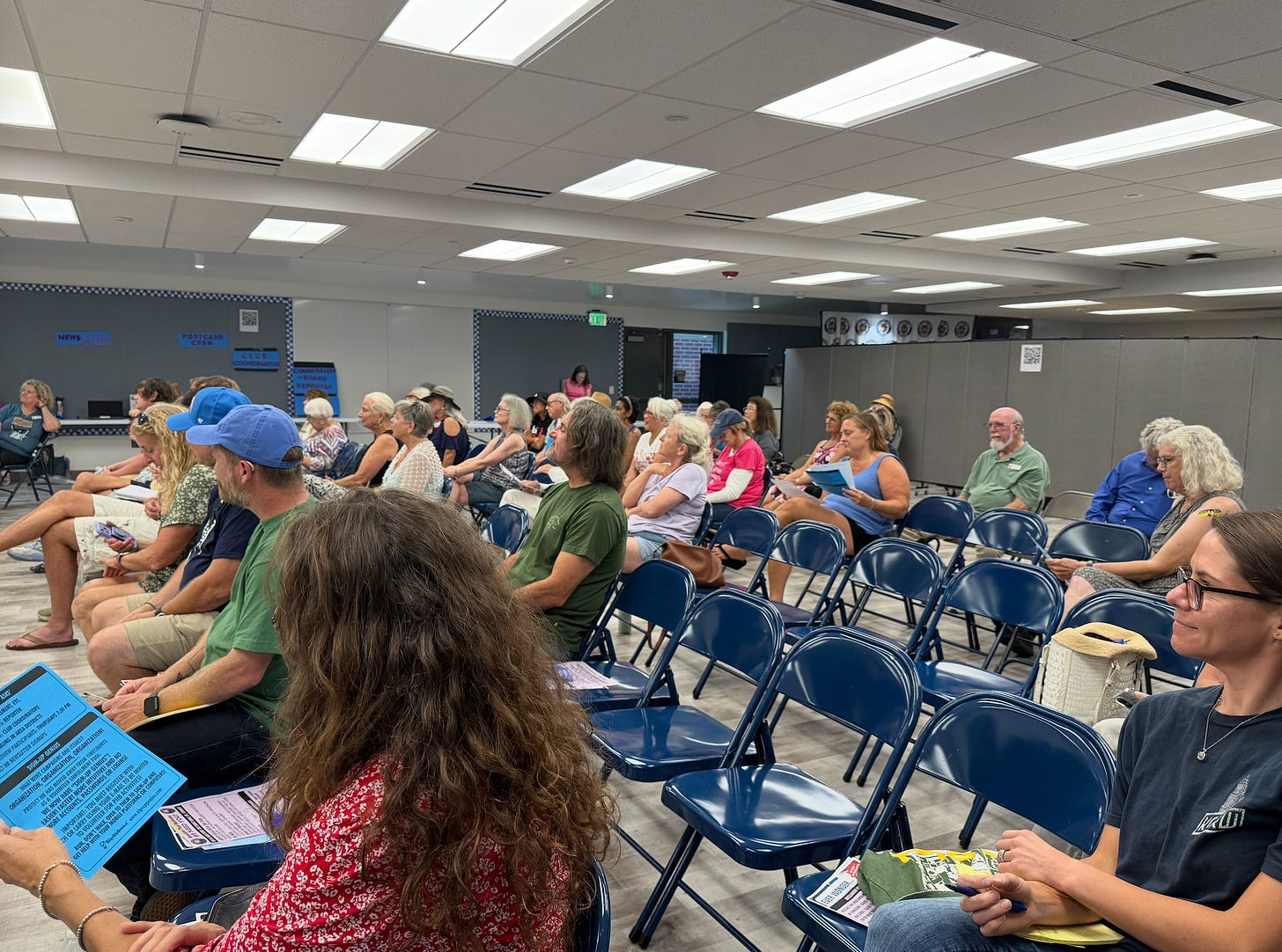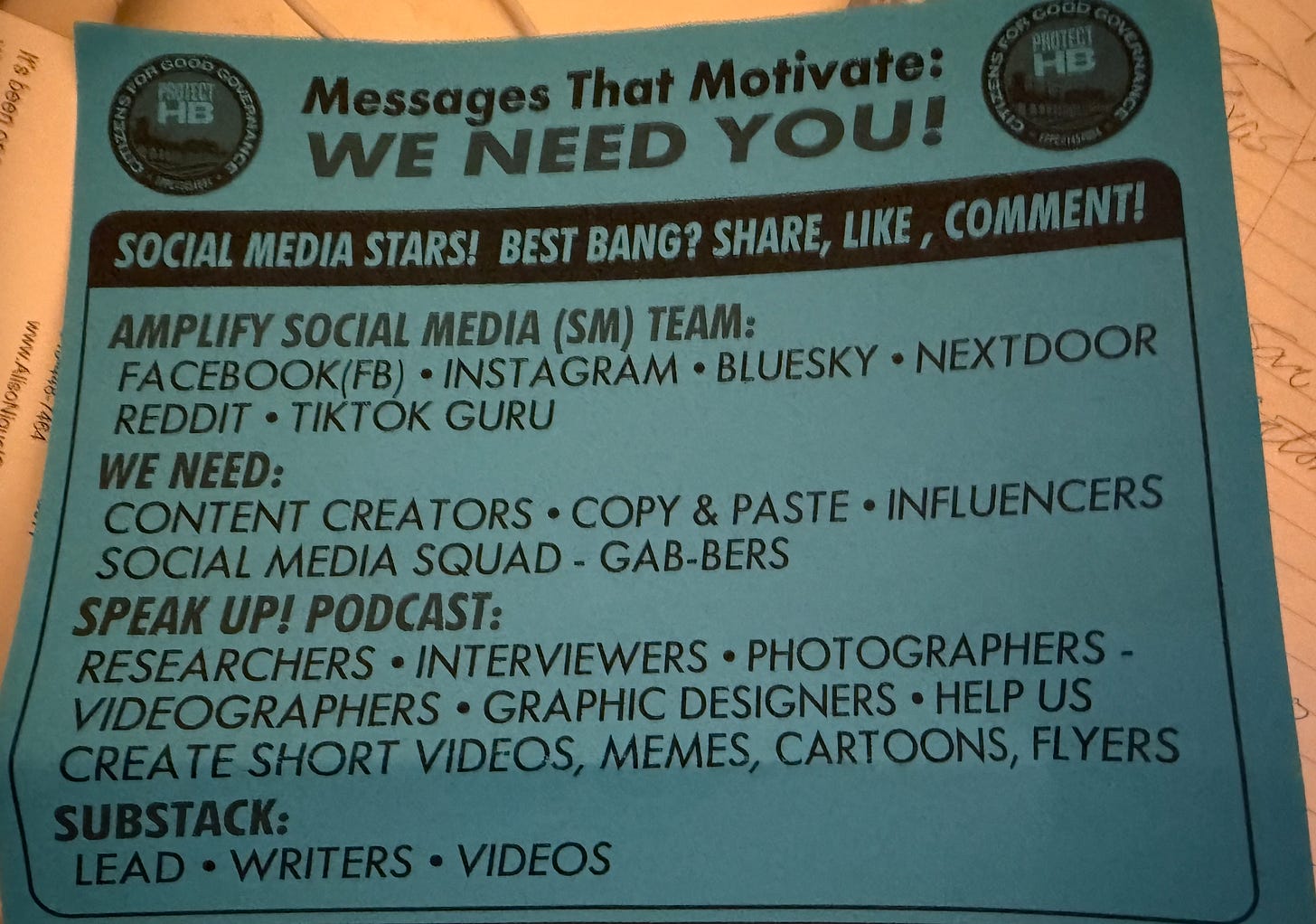 Chris is right. Social media—for good and for bad—is key. We can send 100,000 letters via mail in 2025, and a single TikTok video oftentimes carries more oomph. The problem, however, is so few people know how to use it. The related problem also, is that the people being asked to use it (as was the case at the meeting) are oftentimes, well, senior citizens with no experience outside of posting a grandkid’s school photos on Facebook. This, for example, is a brochure from the event …