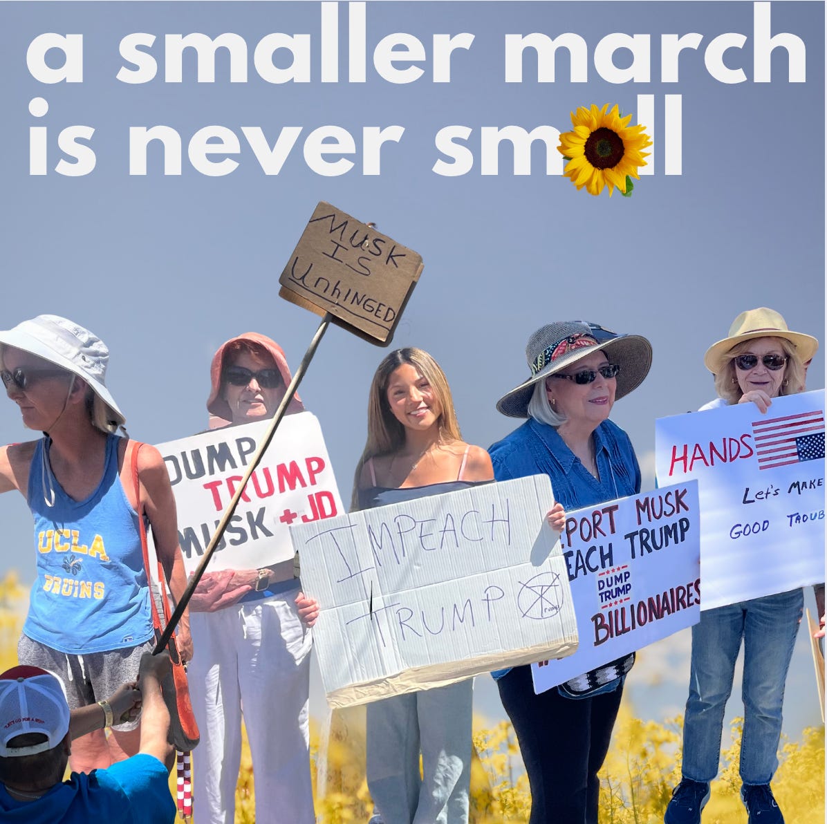 So, really, what made yesterday’s gathering special was that there was nothing overtly special about it. I arrived at approximately 12:20 pm, urged by Tasia Surch of the group SouthOC4Democracy to behold what they had been working on. Beginning back on Feb. 5, she explained, volunteers have congregated weekly at this precise spot—a deliberate stone’s throw from the offices of Young Kim2, the Republican congresswoman who seems nice enough but stubbornly refuses to disengage from her Donald Trump IV drip. Attendance at the Wednesday marches has varied—14 on a rainy day a bunch of weeks back, 300 on Feb. 17, 90 (or so) yesterday.