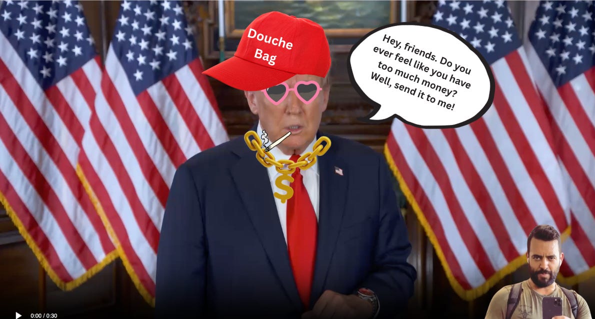 By day, Donald Trump can play act president, sitting behind a desk while Stephen Miller and Russell Vought pull off the final remaining strings off this democracy thing we used to have. By afternoon, Donald Trump can nap on his sofa while dreaming of 15-year-old Annette Funicello in her poodle skirt. And by night, Donald Trump can bleed dry his followers and send them off with bullshit timepiece that scream to all involved, I AM BOTH SUCKER AND DOUCHE.