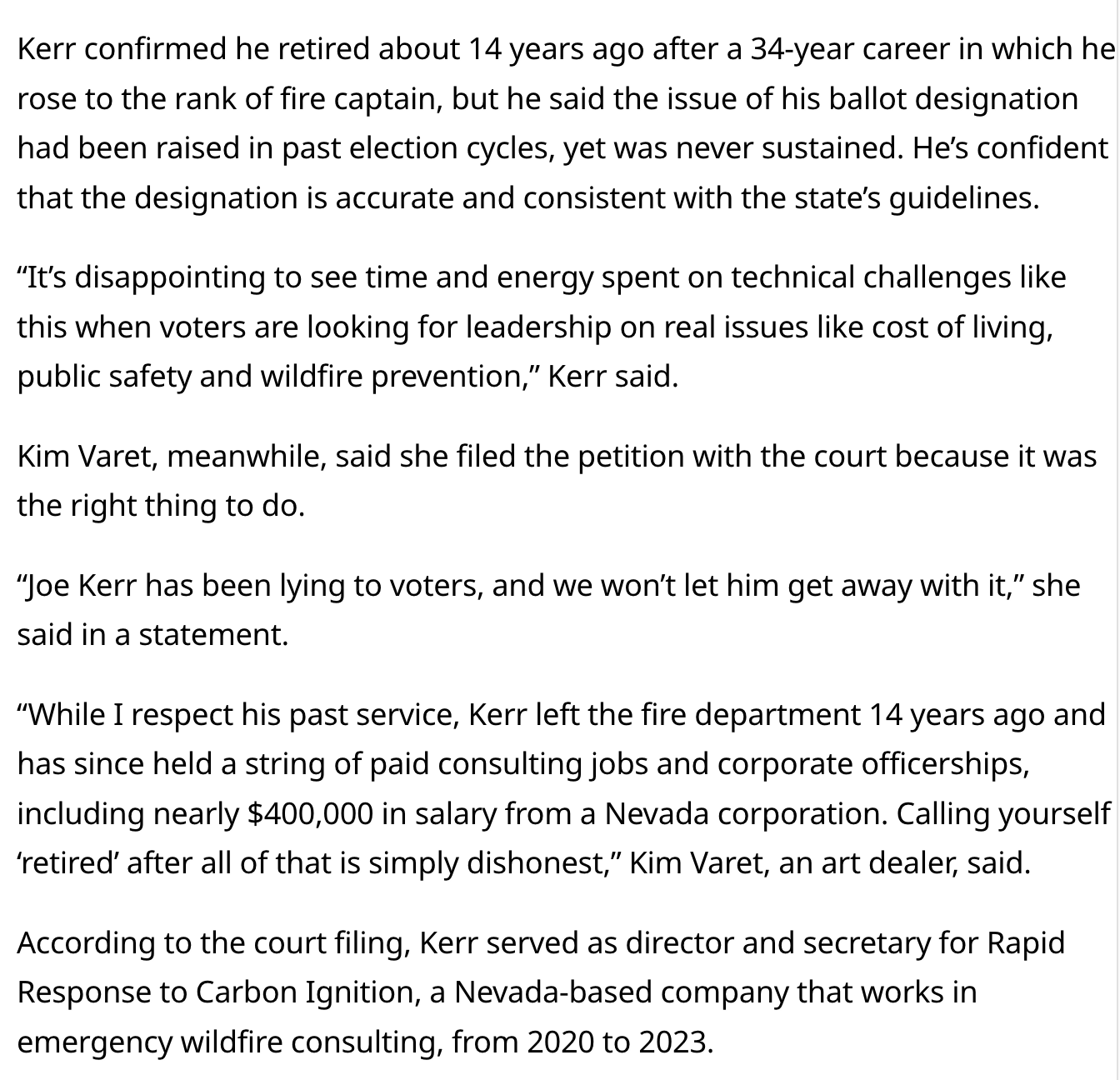 Technically and legally, Esther is probably right. Kerr has, it seems, held other positions since wrapping his career battling blazes. Wrote Schallhorn: “According to the court filing, Kerr served as director and secretary for Rapid Response to Carbon Ignition, a Nevada-based company that works in emergency wildfire consulting, from 2020 to 2023. Kerr said this was a startup company to which he provided subject matter expertise on wildfire cameras in California. This was in correlation to the work he did as a fire captain, Kerr said.”