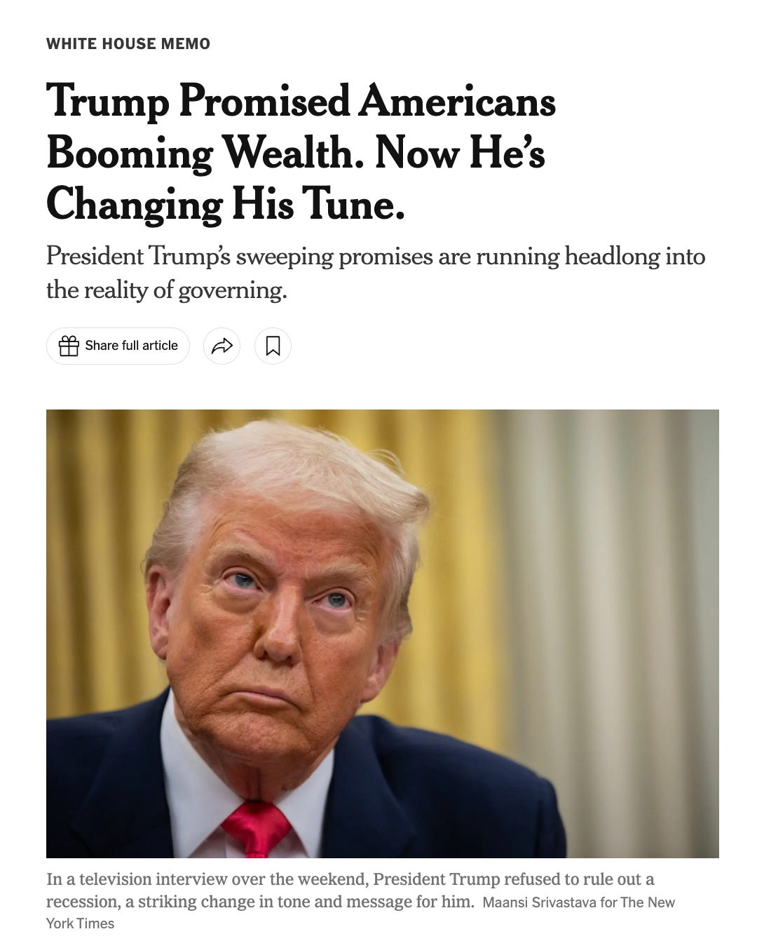 • Trump’s nonsensical bluster is awful for finances. You can’t threaten tariffs, then pull back, then return them, then promise more—without the instability killing investor confidence. ““The market volatility is much less about the bad news of tariffs and much more about the uncertainty of tariffs, especially uncertainty as to what the policy is, where it is headed, how long it will last and what the end result will be,” David Bahnsen, the chief investment officer at the Bahnsen Group, told the Times.