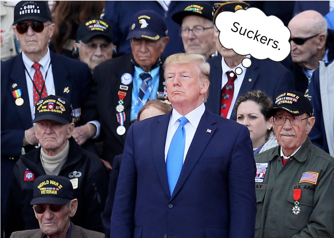 So show them the raw dismissiveness of Alina Habba and her, “Oh, well—shit happens” reaction to those who served being rendered unemployed and useless and sans income. Tell them to wake up. Tell them they’re under assault. Tell them it’s all been a show, and this administration cares for their well-being no more than it cares for the plight of the horse than played Mr. Ed.1