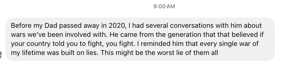 I was DMing with a friend on Facebook earlier today. The topic was the war with Iran—and how awful it seems to be going.