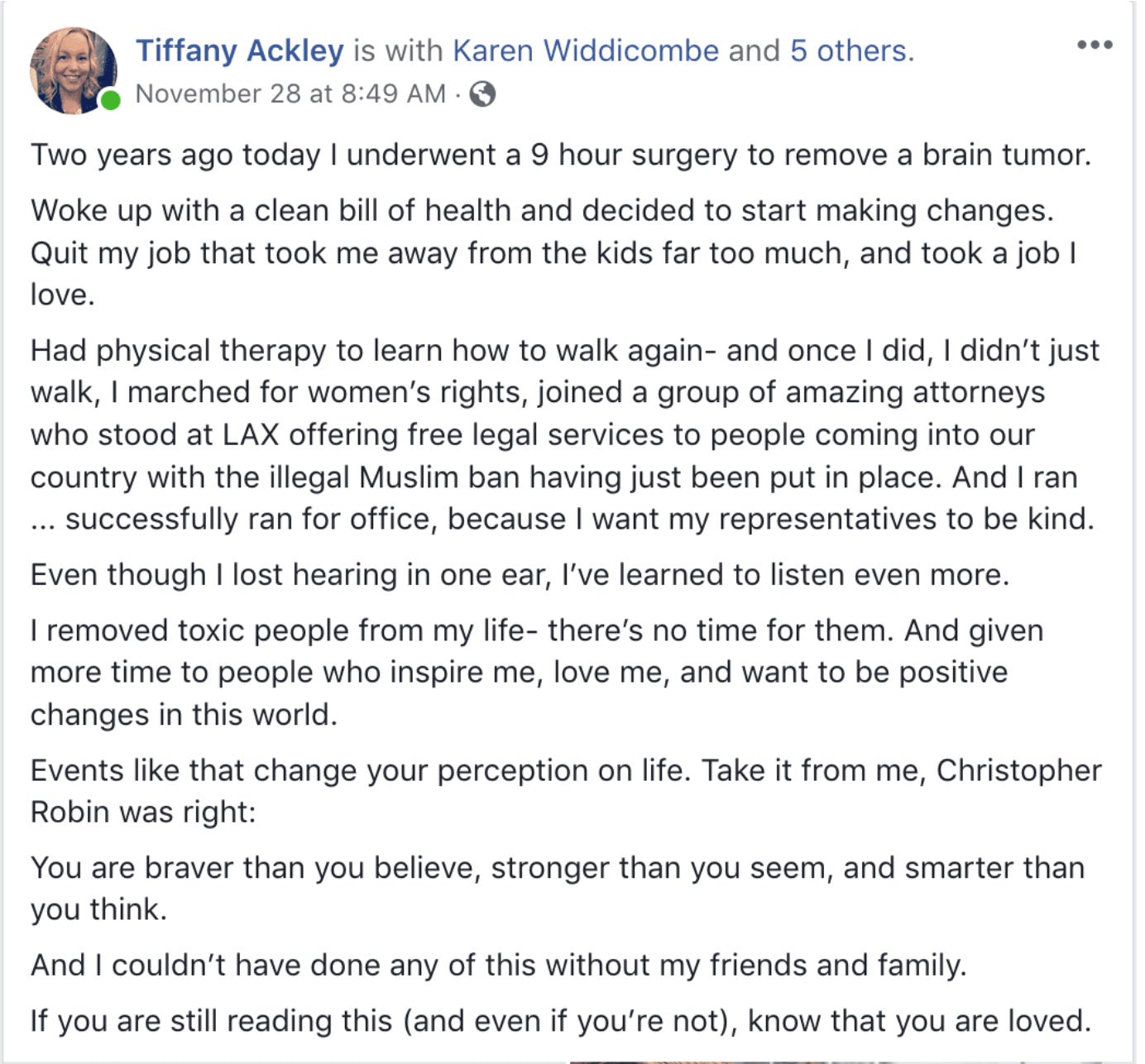 What I’m trying to say is … Tiffany Ackley is the truth. She’s kind, she’s decent, she has an amazing life saga. And if you require an extra spoonful of proof, check out this Facebook post from 2018. Trust me—read it.