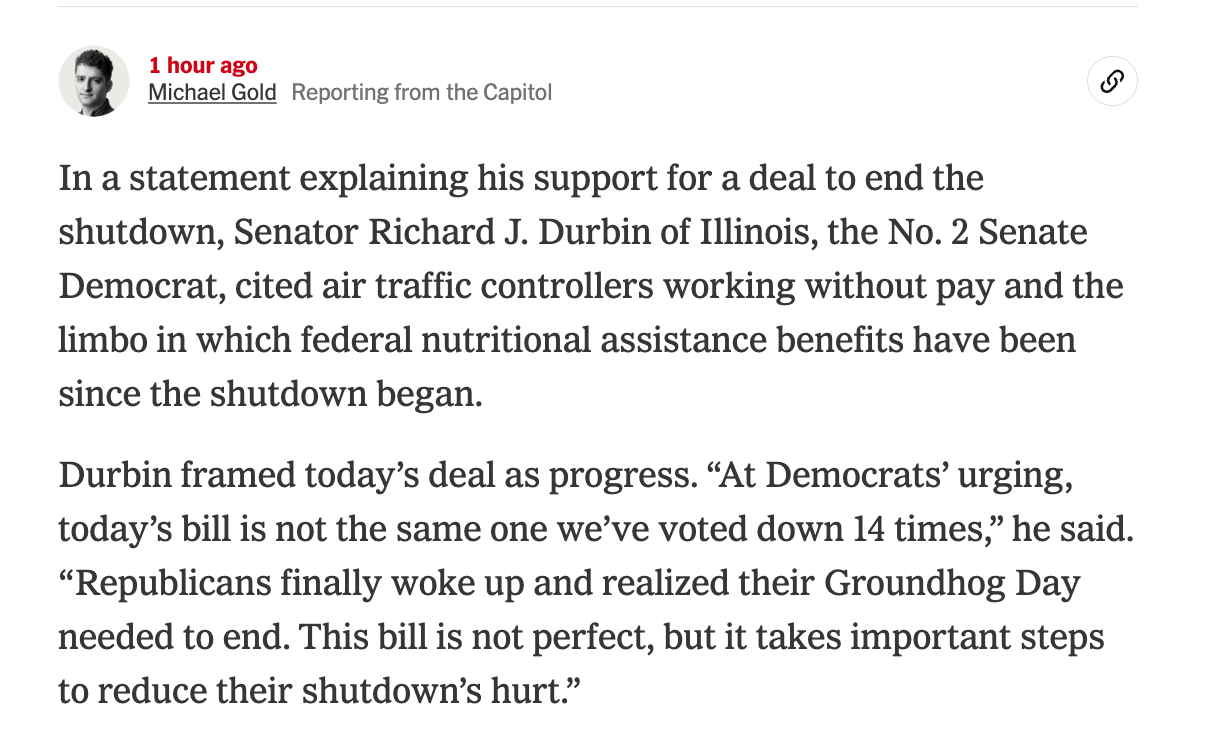 So in case you (wisely) haven’t been paying attention this evening, it appears the government will finally reopen after seven Democratic senators (well, six and one independent) have caved.